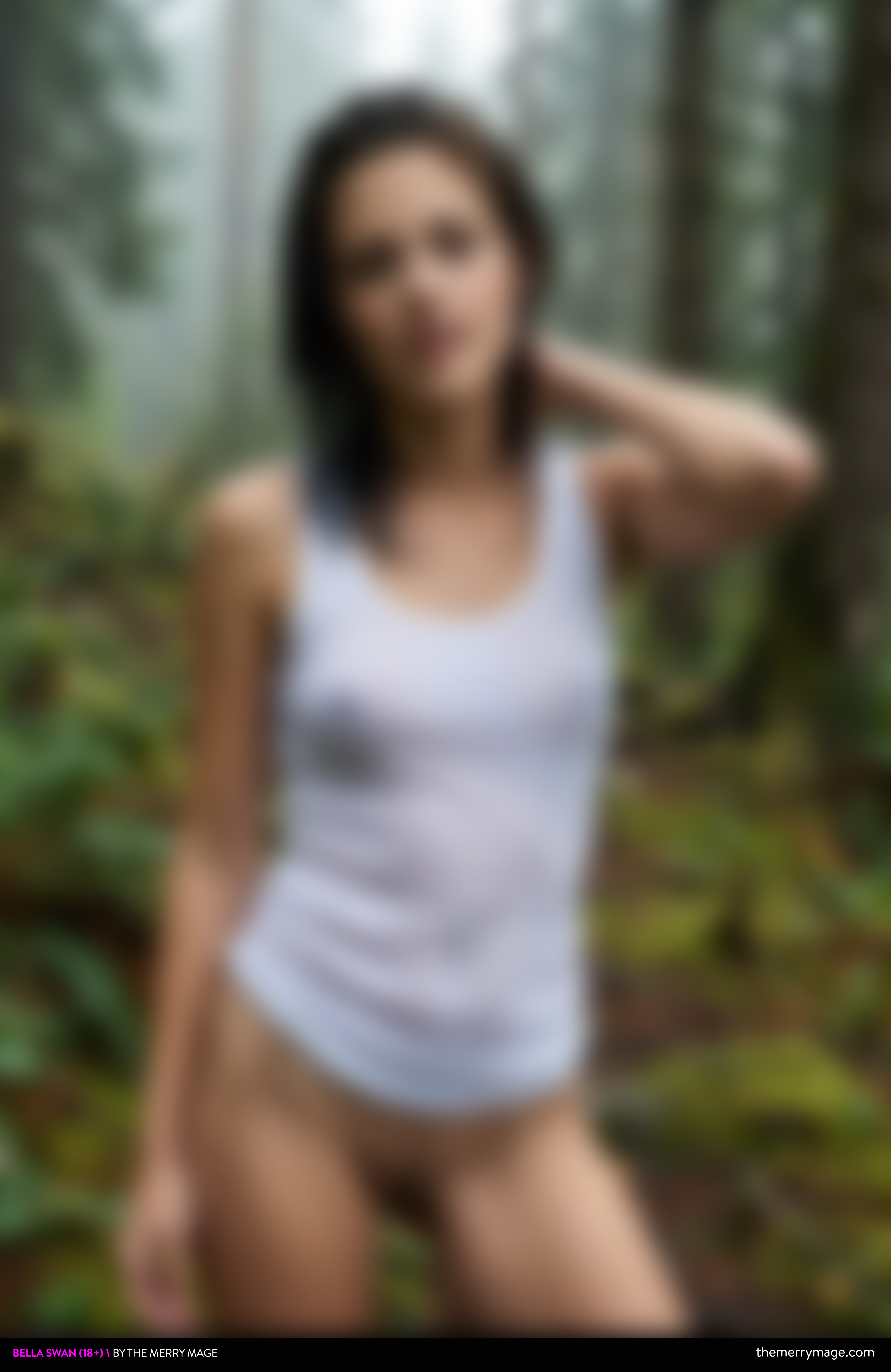 She slipped her jeans off, so she was standing in her thin tank top and white panties. Jacob swallowed hard again but kept shooting, the camera a barrier between them. Emboldened by his silence, Bella pulled the tank top over her head, exposing her small breasts to the chill air and misty rain.