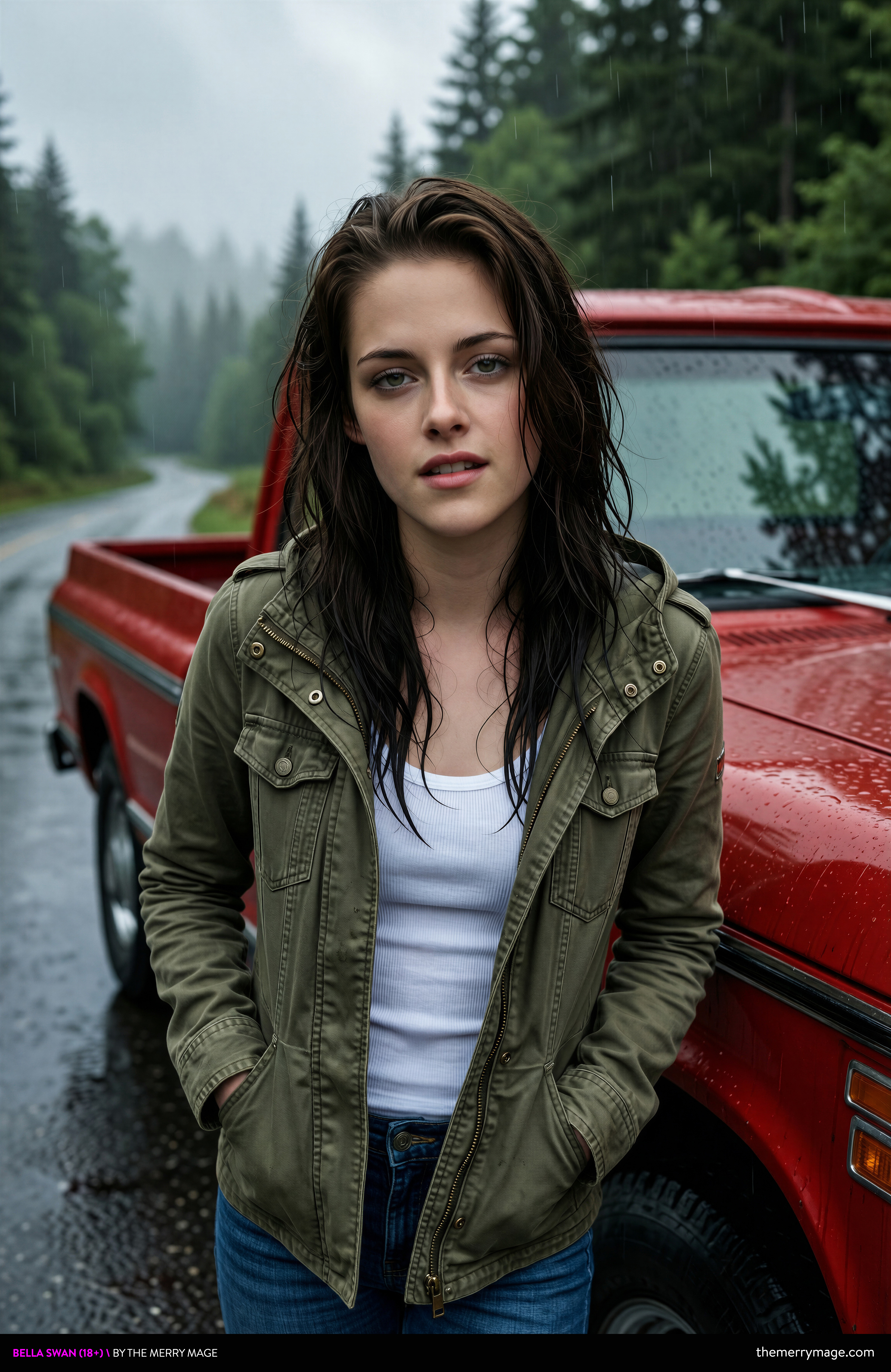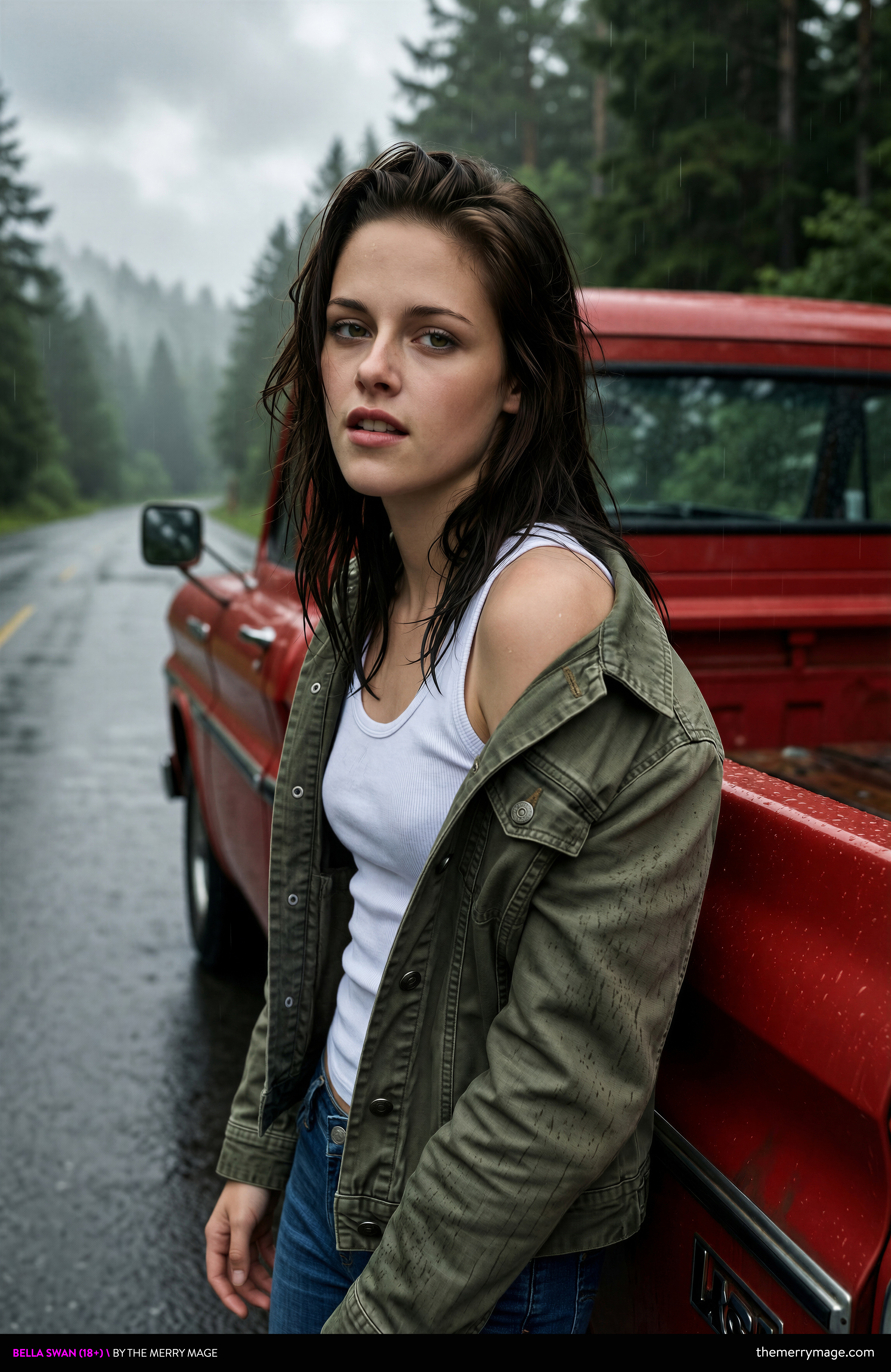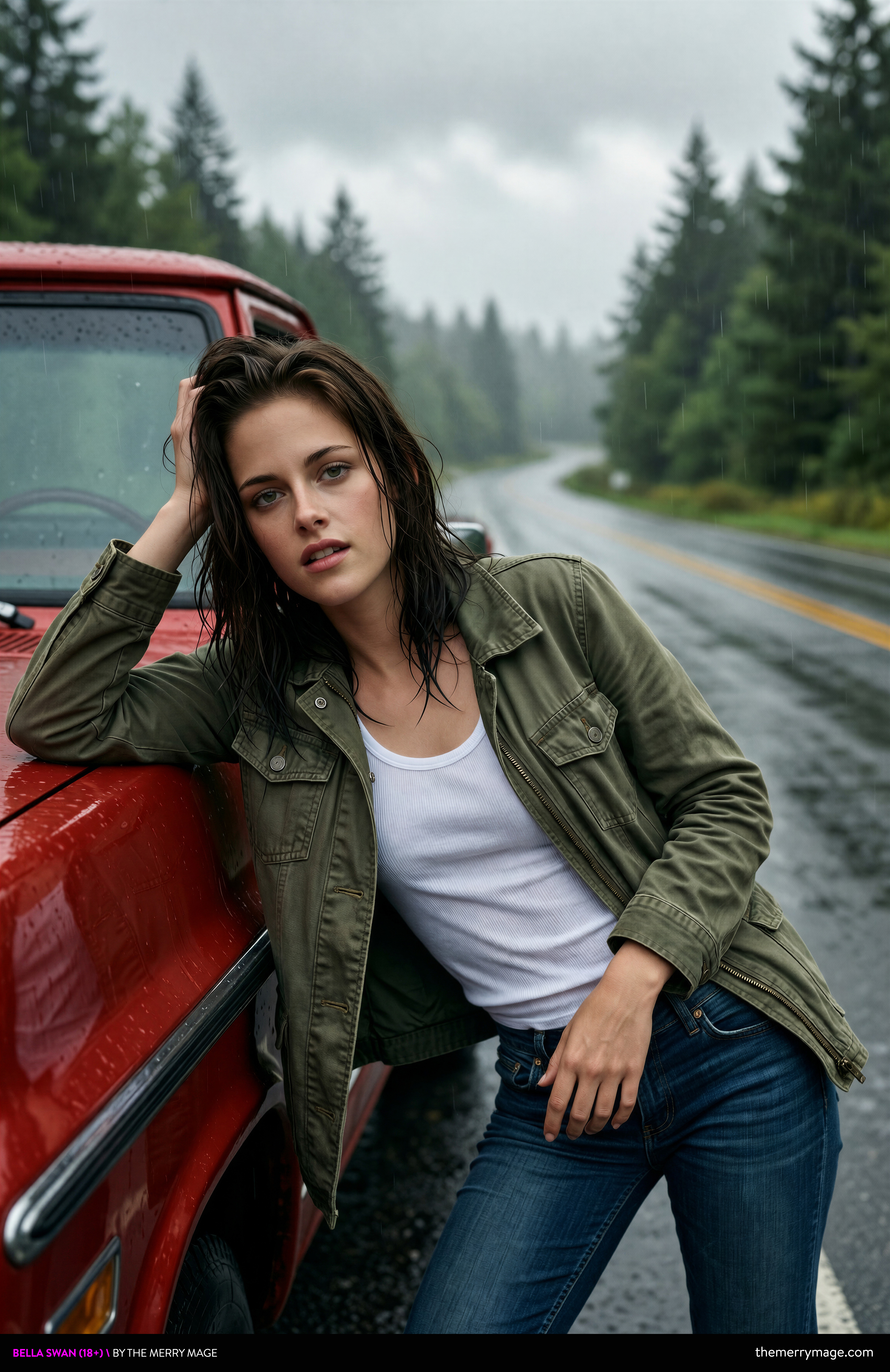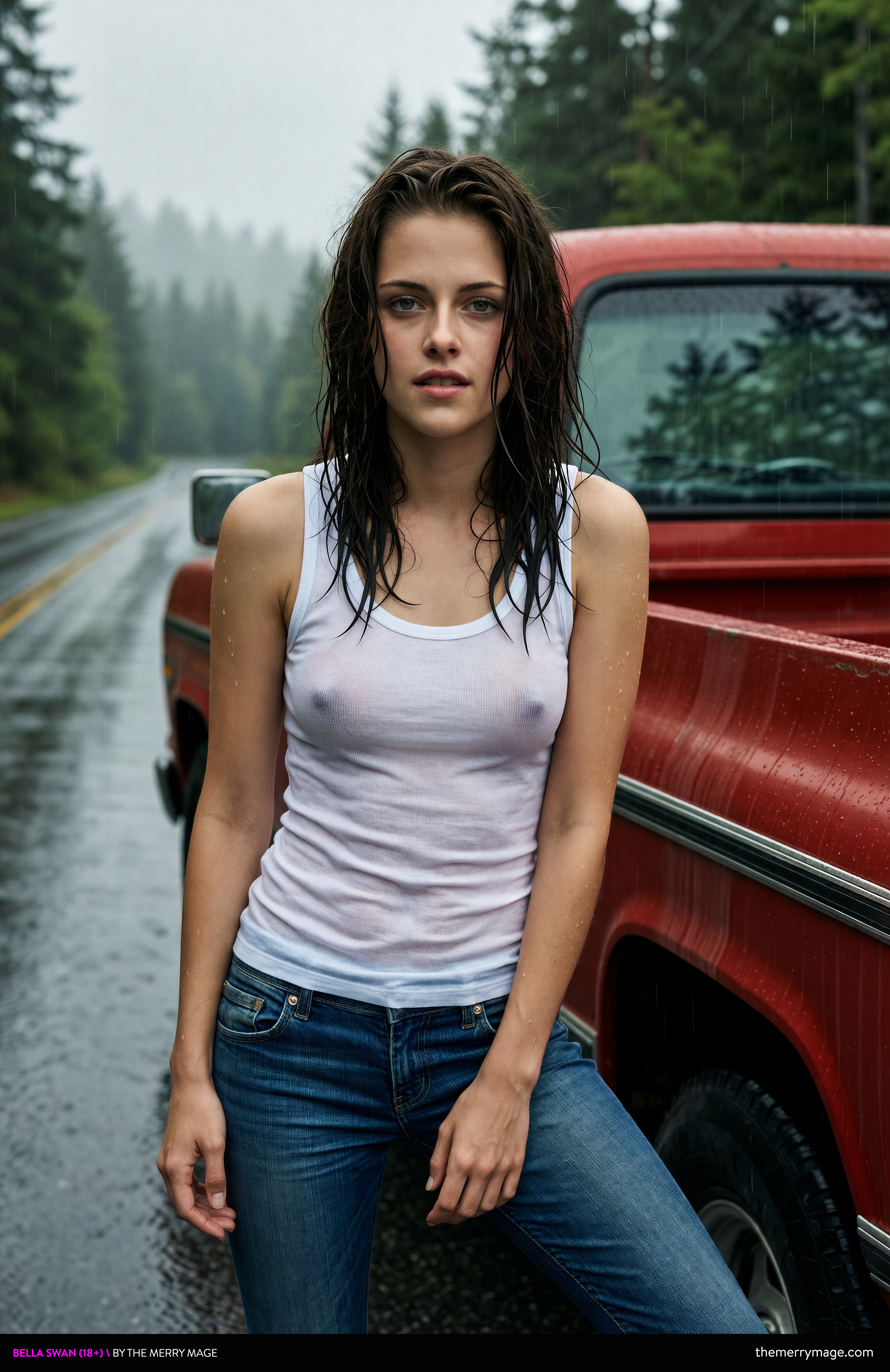 Bella was pressed against him in the narrow space, breathing hard, her bare skin damp from the misting rain. Jacob became painfully aware of every point of contact—her thigh against his, her shoulder brushing his arm, her hair tickling his neck. The rain had left tiny droplets across her skin that caught what little light filtered through the windshield.