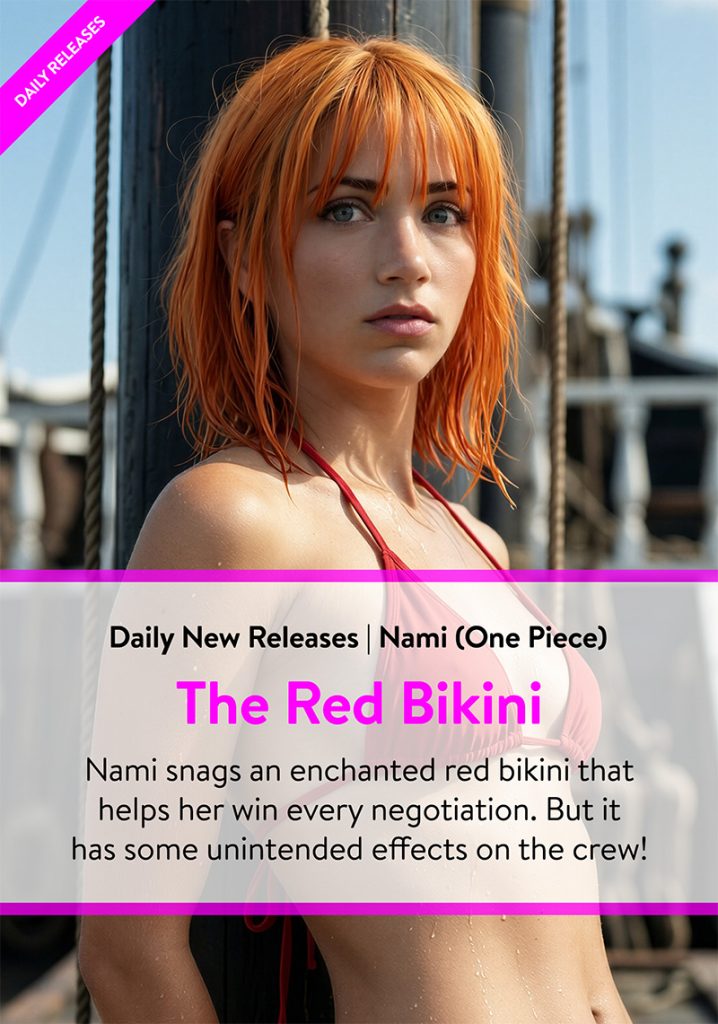 ONE PIECE The Red Bikini Featuring: Nami & Crew of the Sunny Join as a member This set is currently in progress with daily new releases! Check back often to see new scenes as I release them! The Sunny rocked gently against the dock, the familiar creaking of wood and rope a comfort to Usopp…