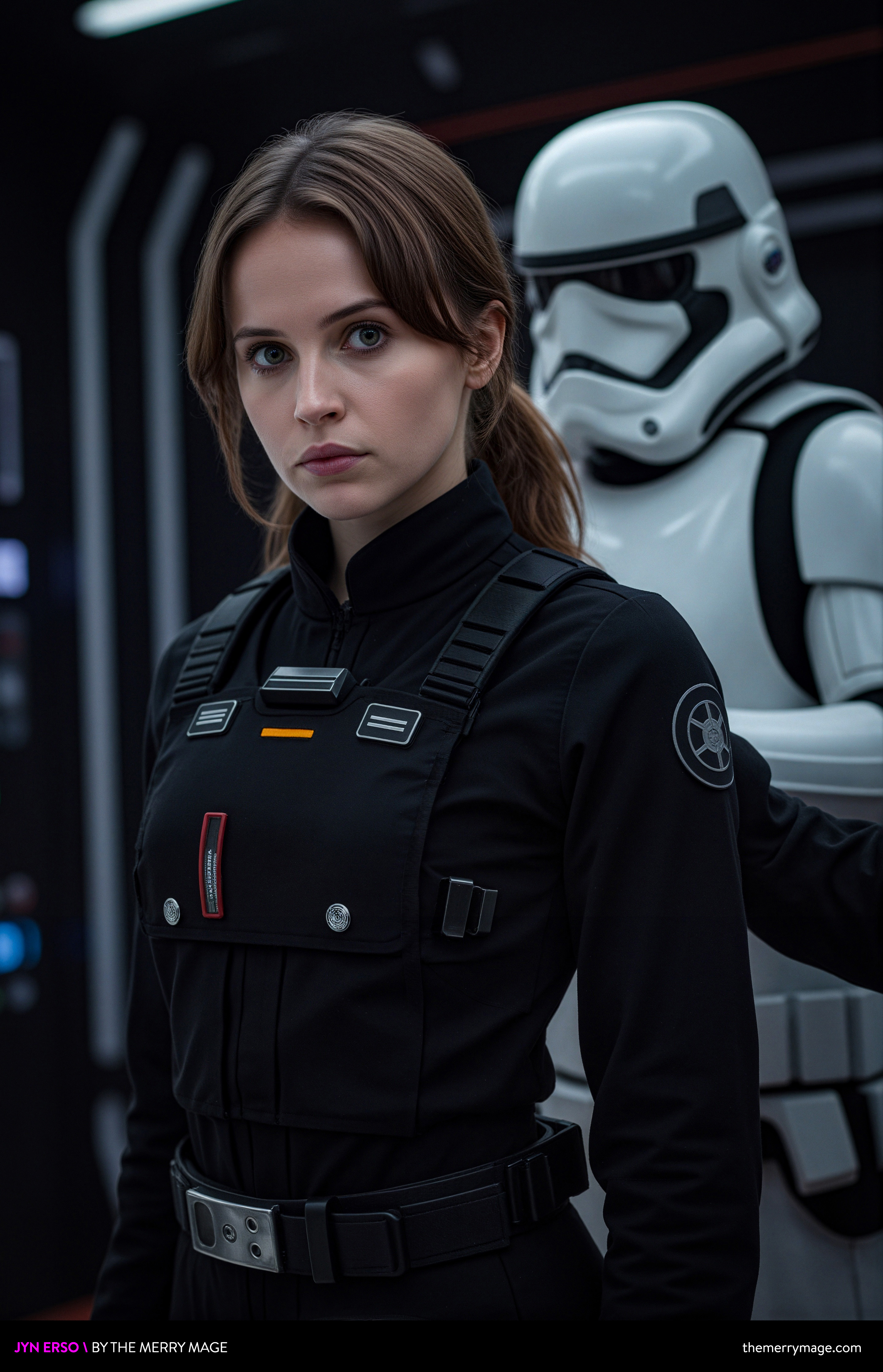 The doors behind her hissed open. Leia turned—only as much as the stormtrooper’s grip allowed—and saw the other prisoner, still dressed in a stolen imperial uniform. Jyn Erso, walking, or being walked, chin up but hair askew, a scab splitting her lip at the center.