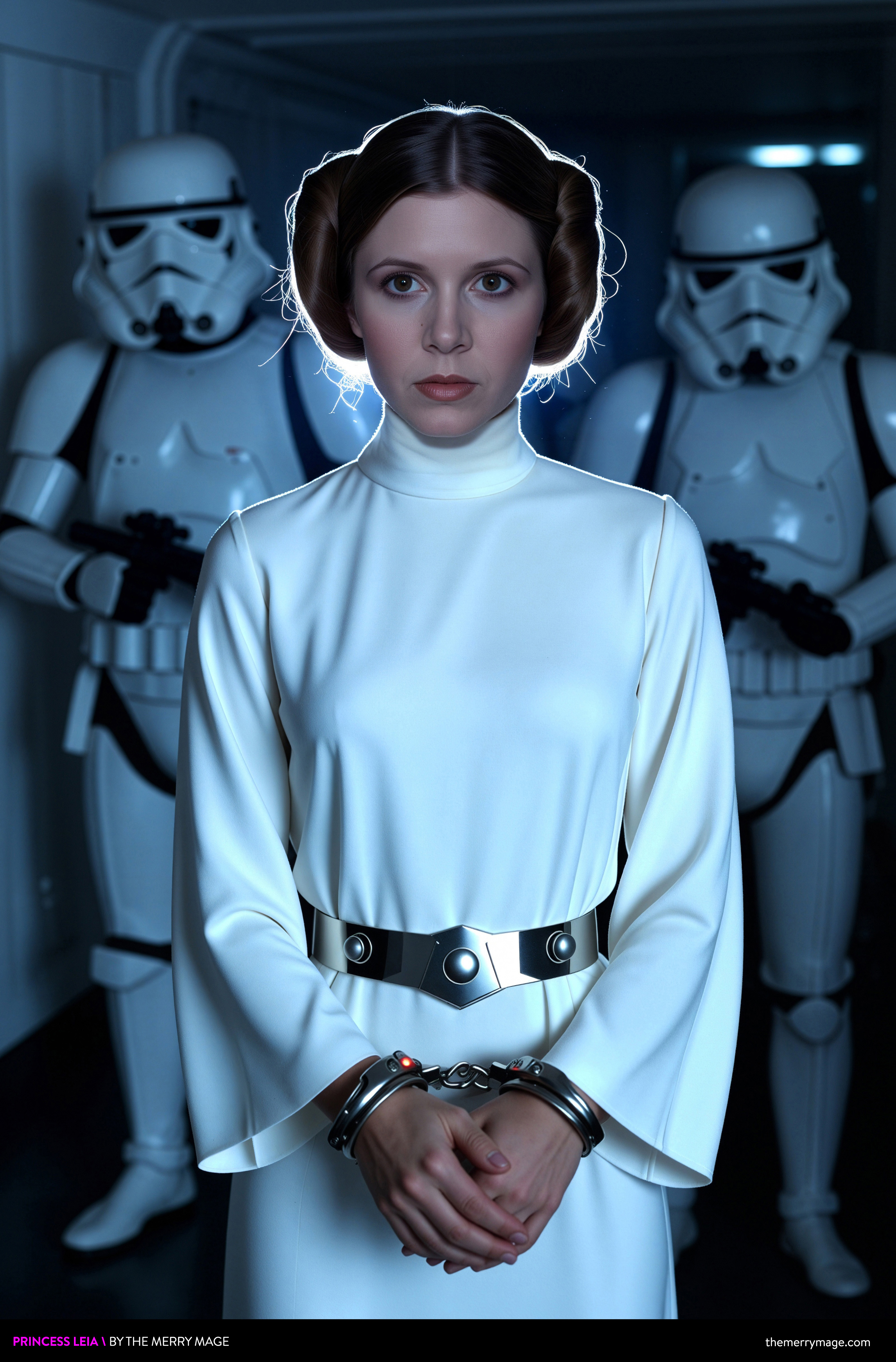 The blast doors cycled open with a hydraulic groan. Princess Leia glided between two troopers, chin high, wrists bound in elegant restraint. Her white shift was somehow immaculate, as if the Empire’s best efforts at humiliation had only allowed her to launder it by sheer force of will. She made a show of yawning as she was marched into the cell block’s interrogation chamber.