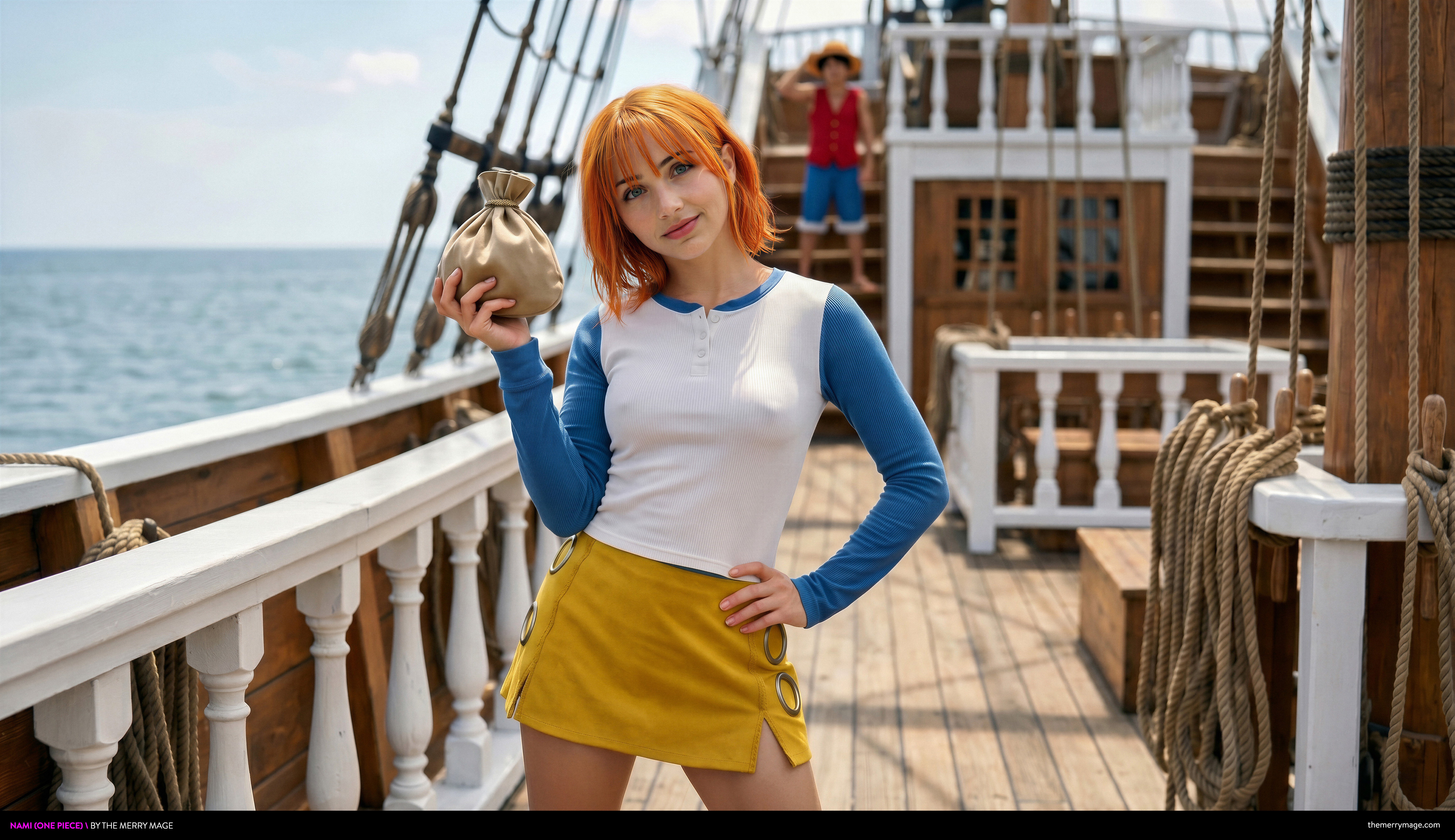 He looked up from his work to see Nami bounding up the gangplank, her face lit with that particular smile she reserved for only one thing: a successful financial transaction. Her orange hair caught the sunlight as she practically skipped onto the deck.